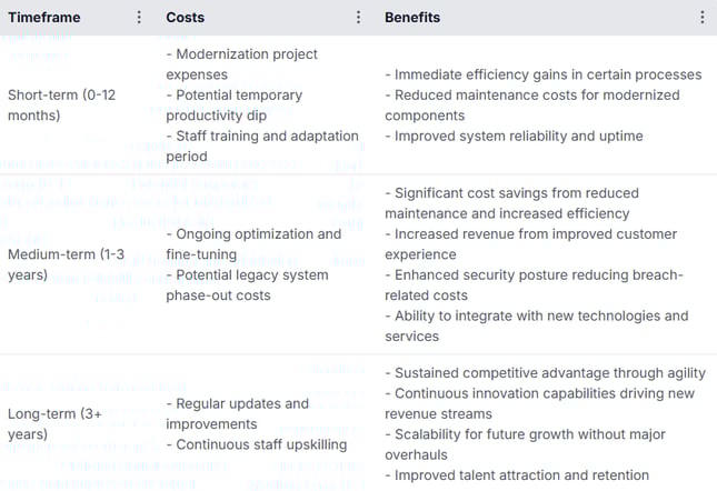 Action Item: Conduct a comprehensive cost-benefit analysis that projects savings and revenue growth over a 5-year period to truly capture the long-term value of modernization. Include factors such as: